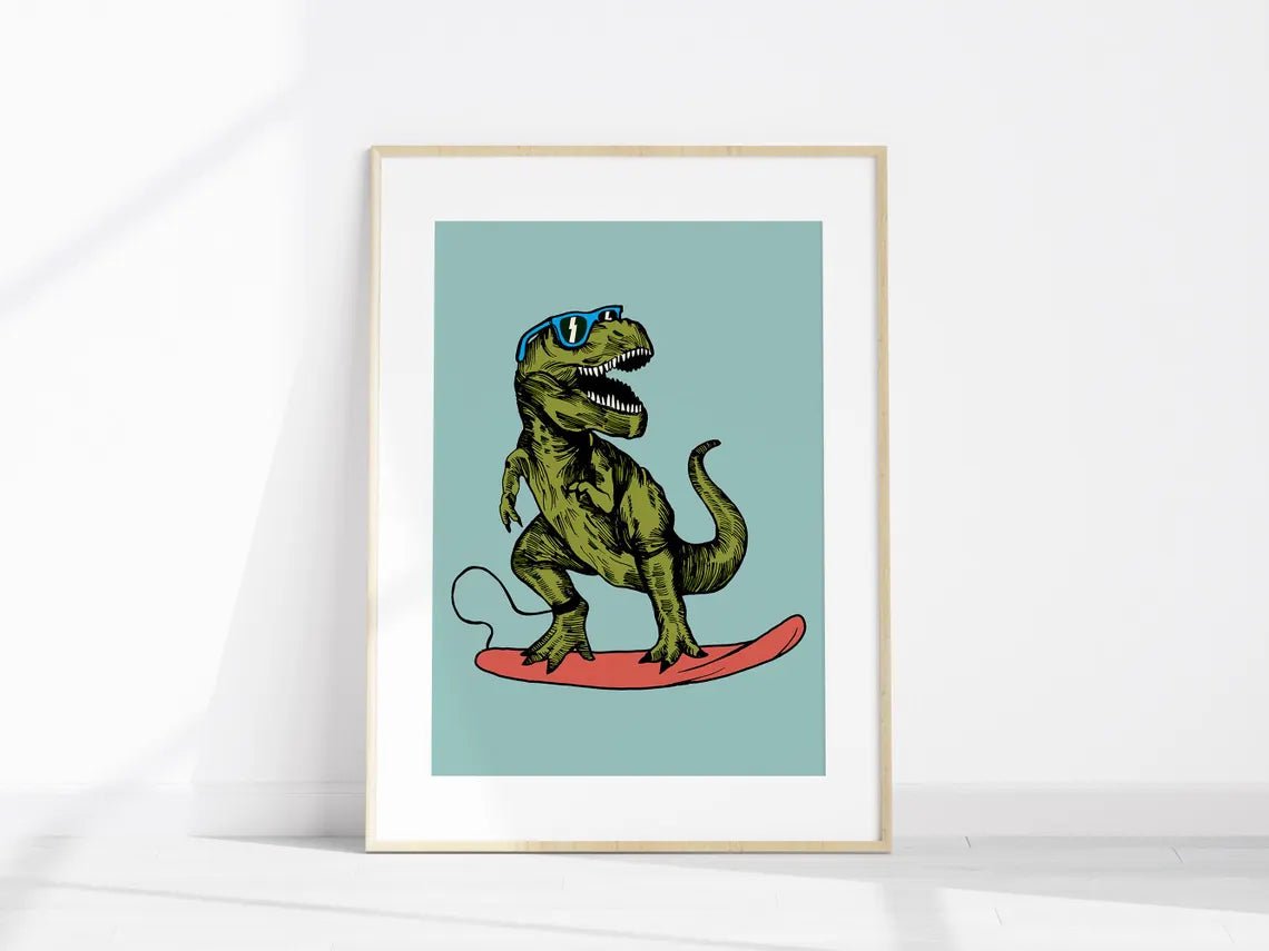 T-Rex On Surfboard Children's Poster shows a fantastic dinosaur ready to ride the waves on his surfboard. This humorous and colorful poster adds a fun and adventurous atmosphere to the children's room. Children who love dinosaurs, surfing and excitement will find great joy in this poster's imaginative design. It is ideal for inspiring play and exploration and is guaranteed to brighten up the room. A perfect gift for children who love both action and the sea!