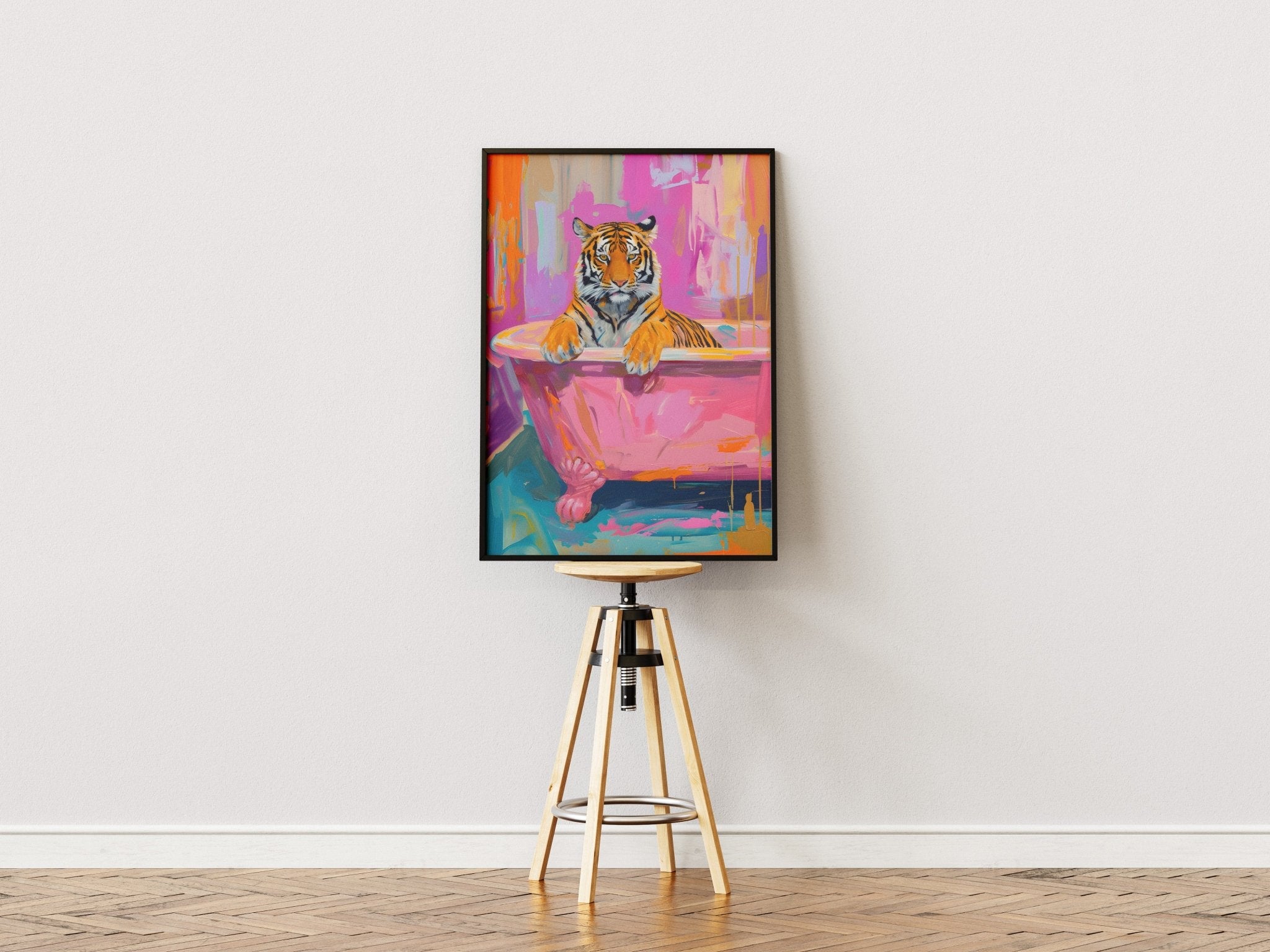 Perfect for the living room, bathroom or as part of a humorous picture wall. Printed on quality material , Tiger In Bath - Pink Poster ensures sharp details and beautiful colors, making it a unique and eye-catching work of art.