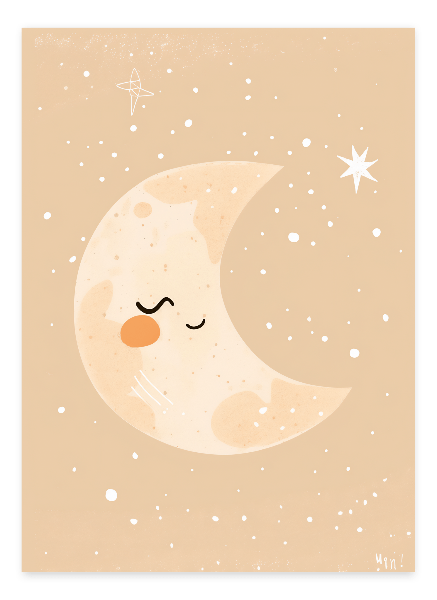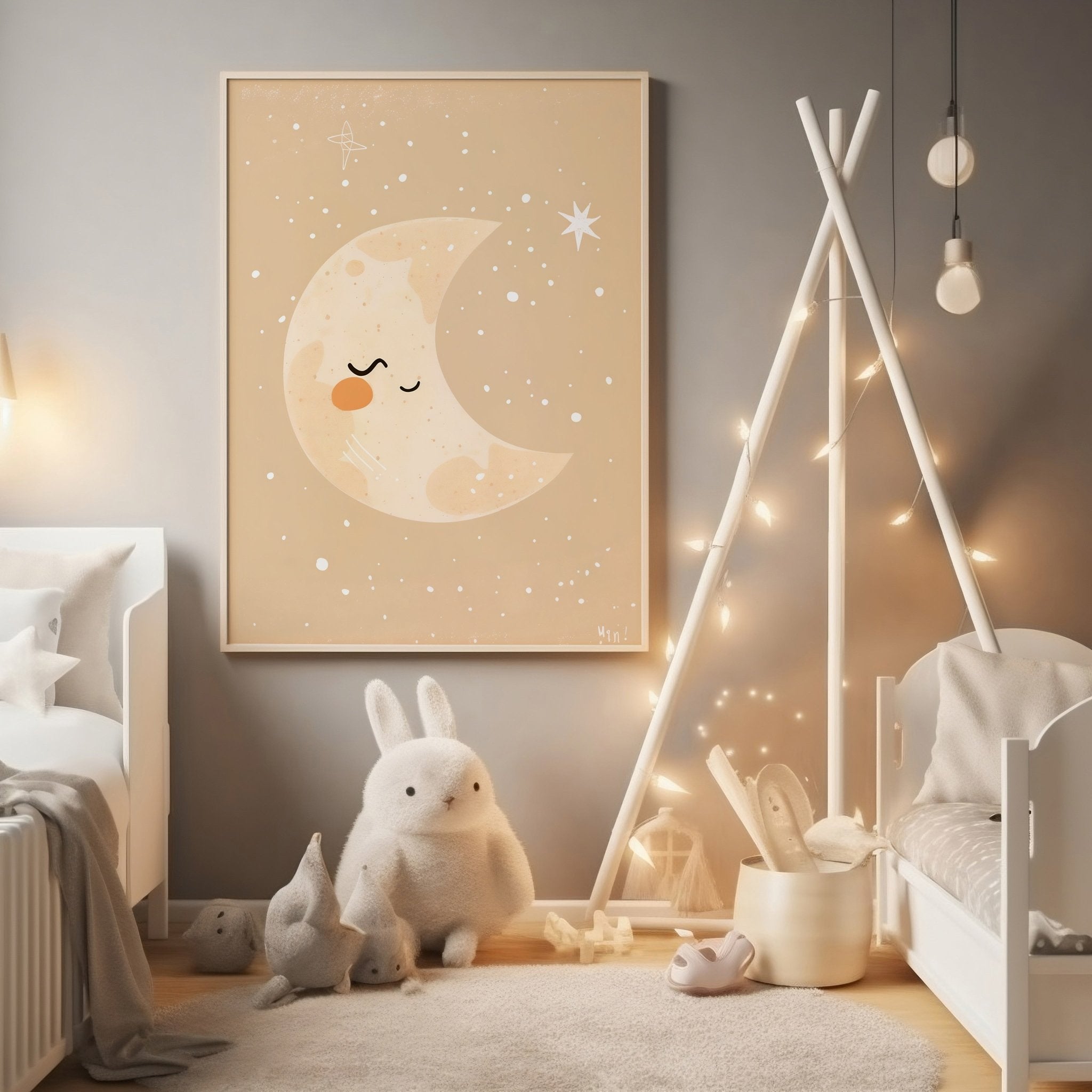Let your child fall asleep safely with Tired Moon - Children's Poster . This children's poster shows a sleepy and peaceful moon, perfect for creating a calming atmosphere at bedtime. The soft colors and calm design make it ideal for a cozy and safe atmosphere.